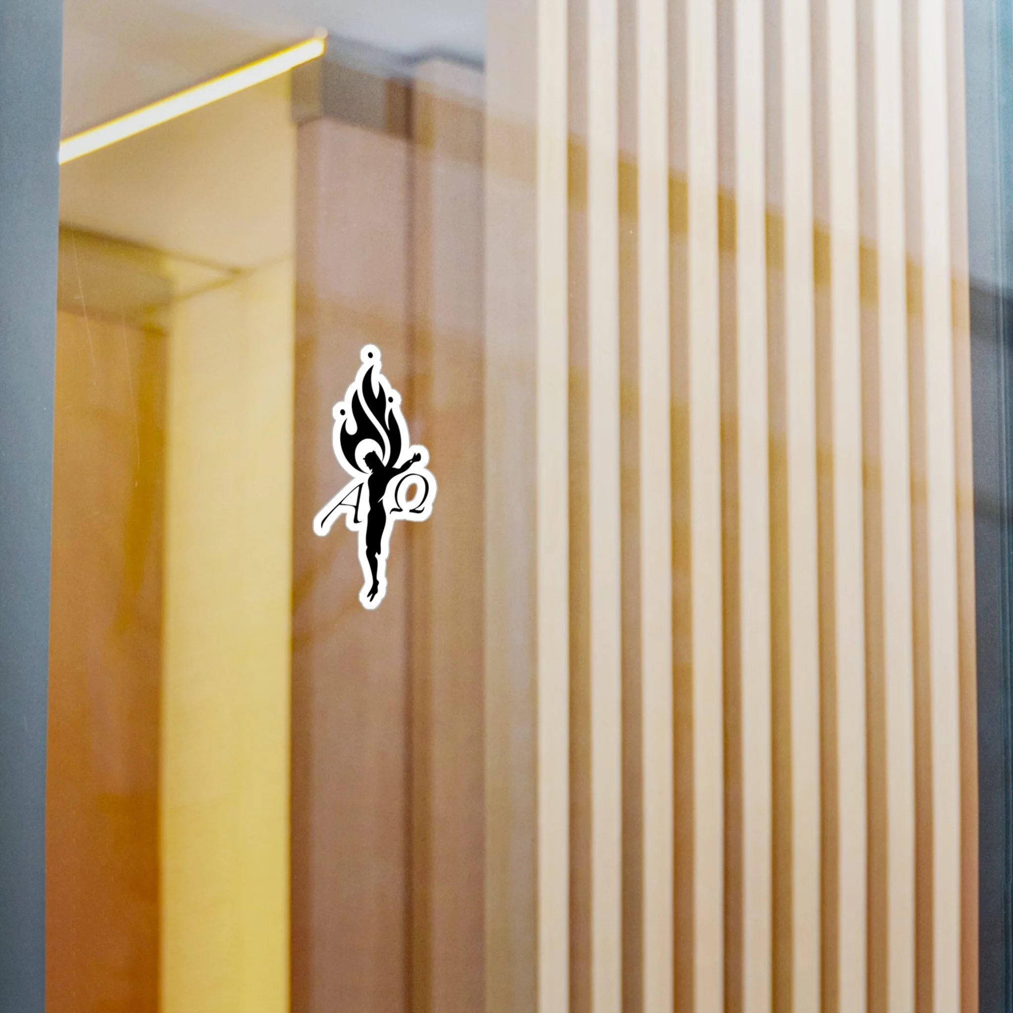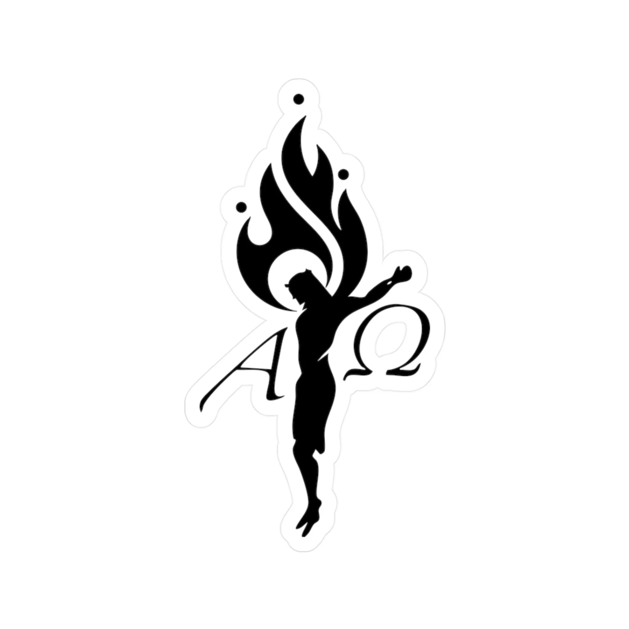 A small, satin-finish vinyl decal that carries quiet symbolism with bold contrast. The black silhouette—a figure rising beneath a stylized flame with the letters Alpha and Omega—reads like a personal emblem on water bottles, laptop lids, car windows, or notebooks. The subtle white kiss-cut border gives each sticker a crisp outline and makes it easy to peel and place. Weatherproof and scratch-resistant, the design keeps its deep blacks and sharp edges outdoors for years, while removable adhesive lets you change placements without residue.