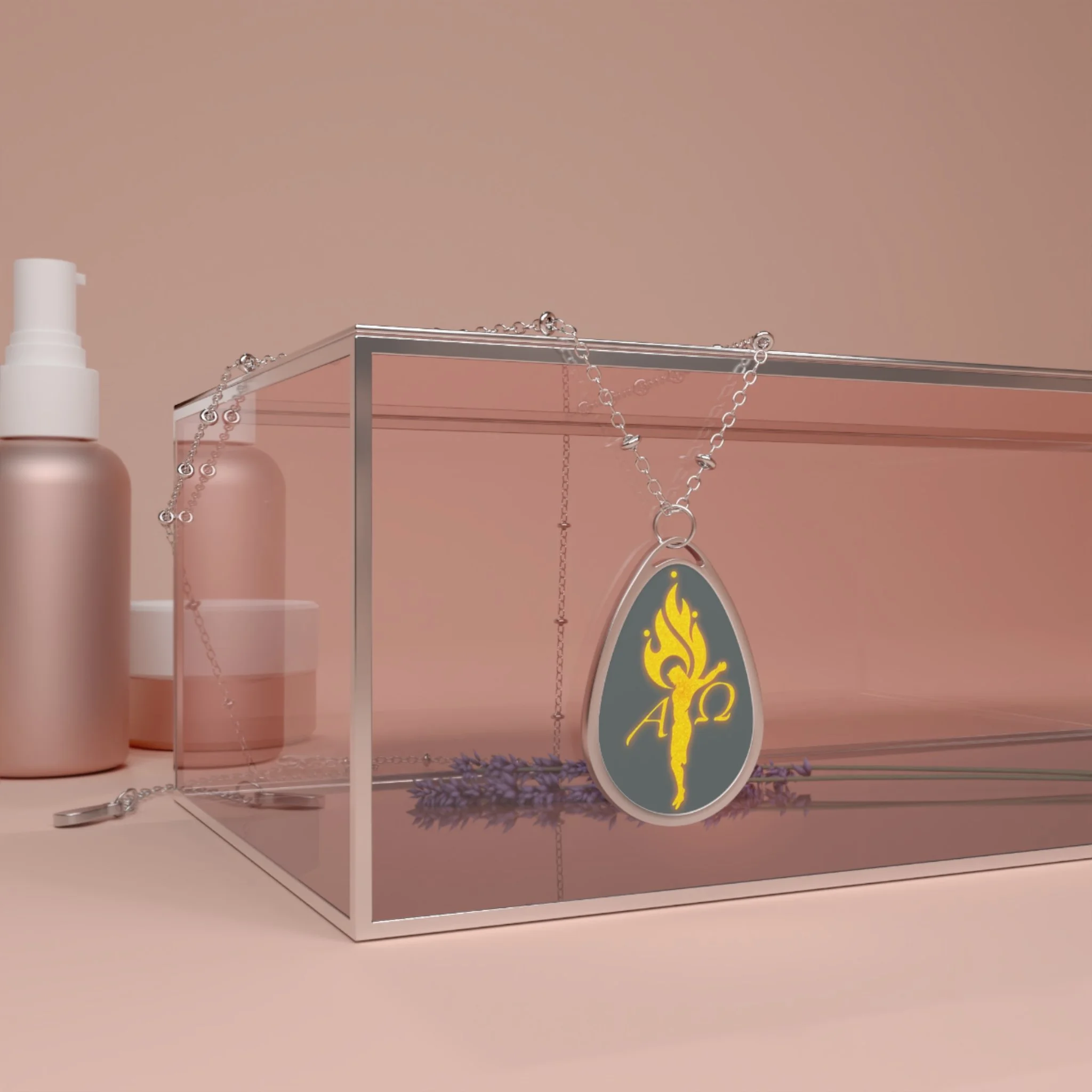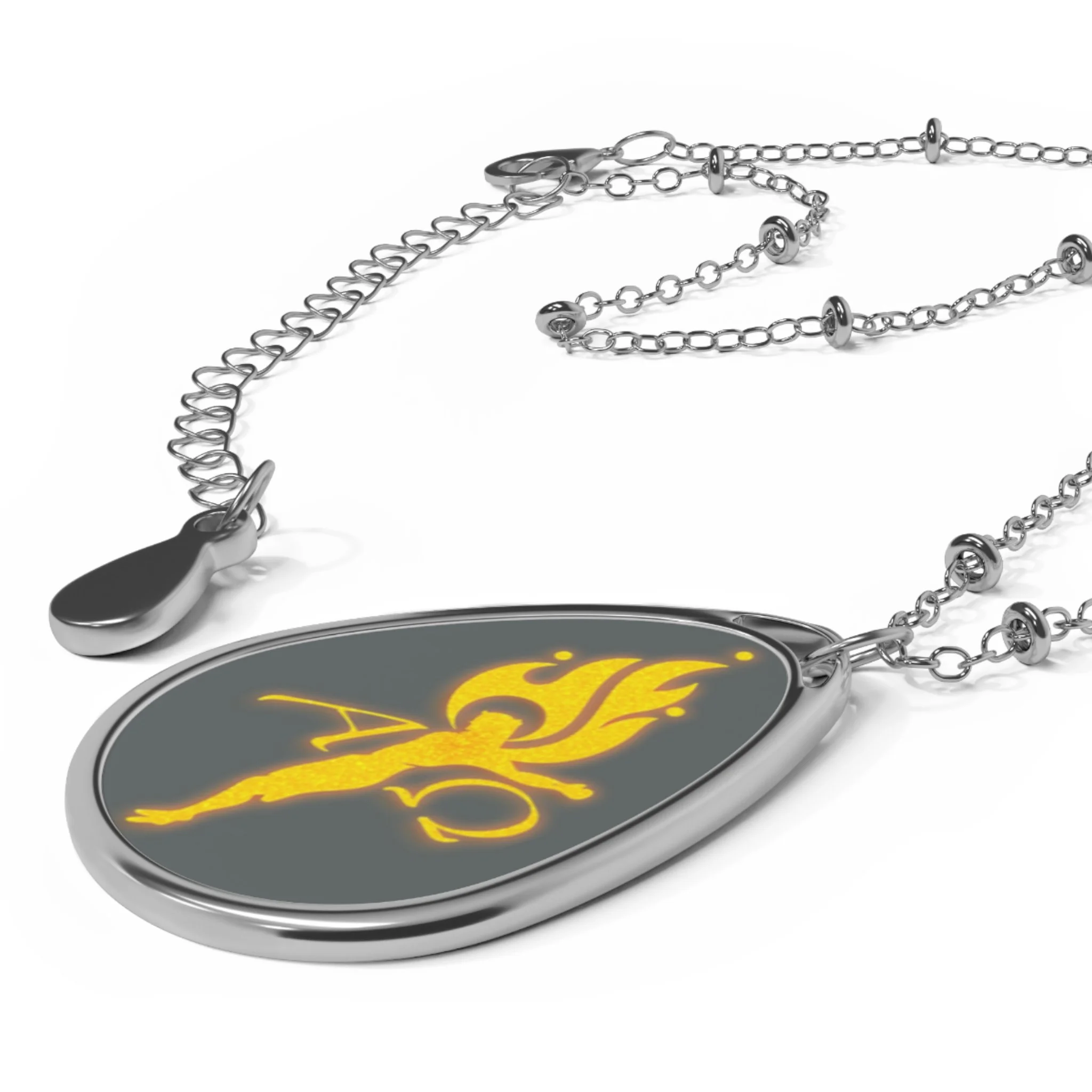 This ellipse pendant necklace layers quiet strength with a flash of color. The glossy, full-color print sits on a white aluminum surface, making the yellow flame emblem pop against the charcoal background. The teardrop-shaped pendant hangs from a slim zinc-alloy chain with small bead accents, and a sturdy lobster clasp keeps it securely in place. Wear it close to your collarbone to add a subtle emblem of warmth and resilience to everyday outfits, or slip it on for evenings when you want a single, meaningful accent that feels both personal and polished.